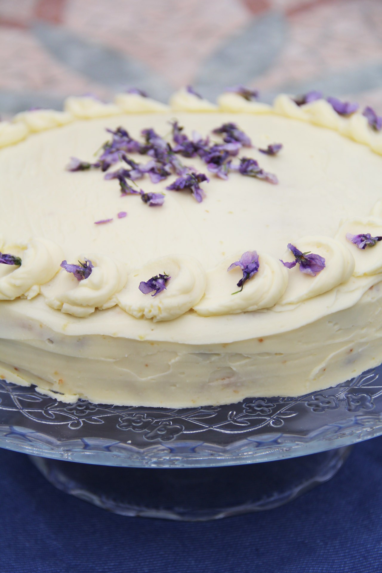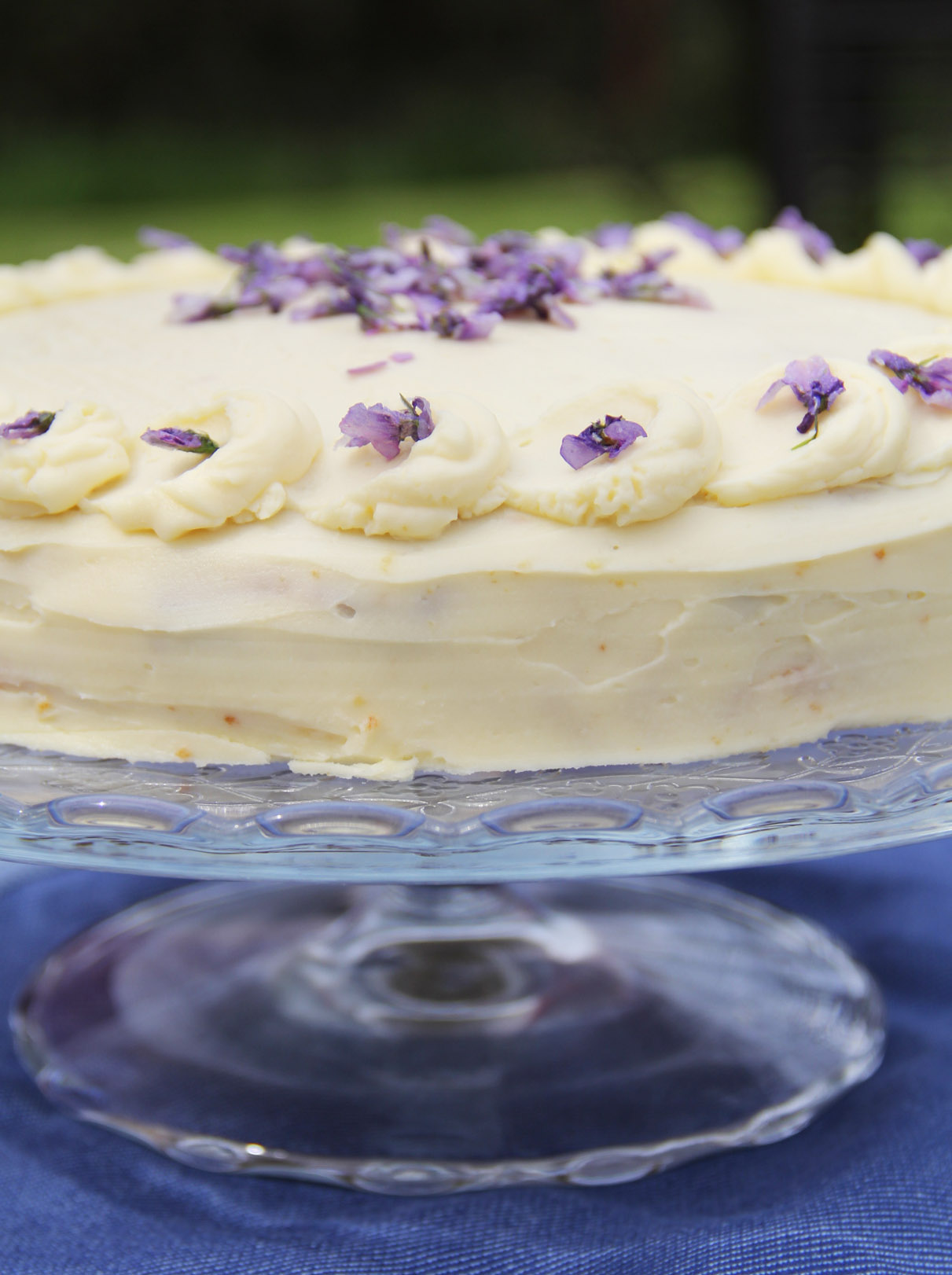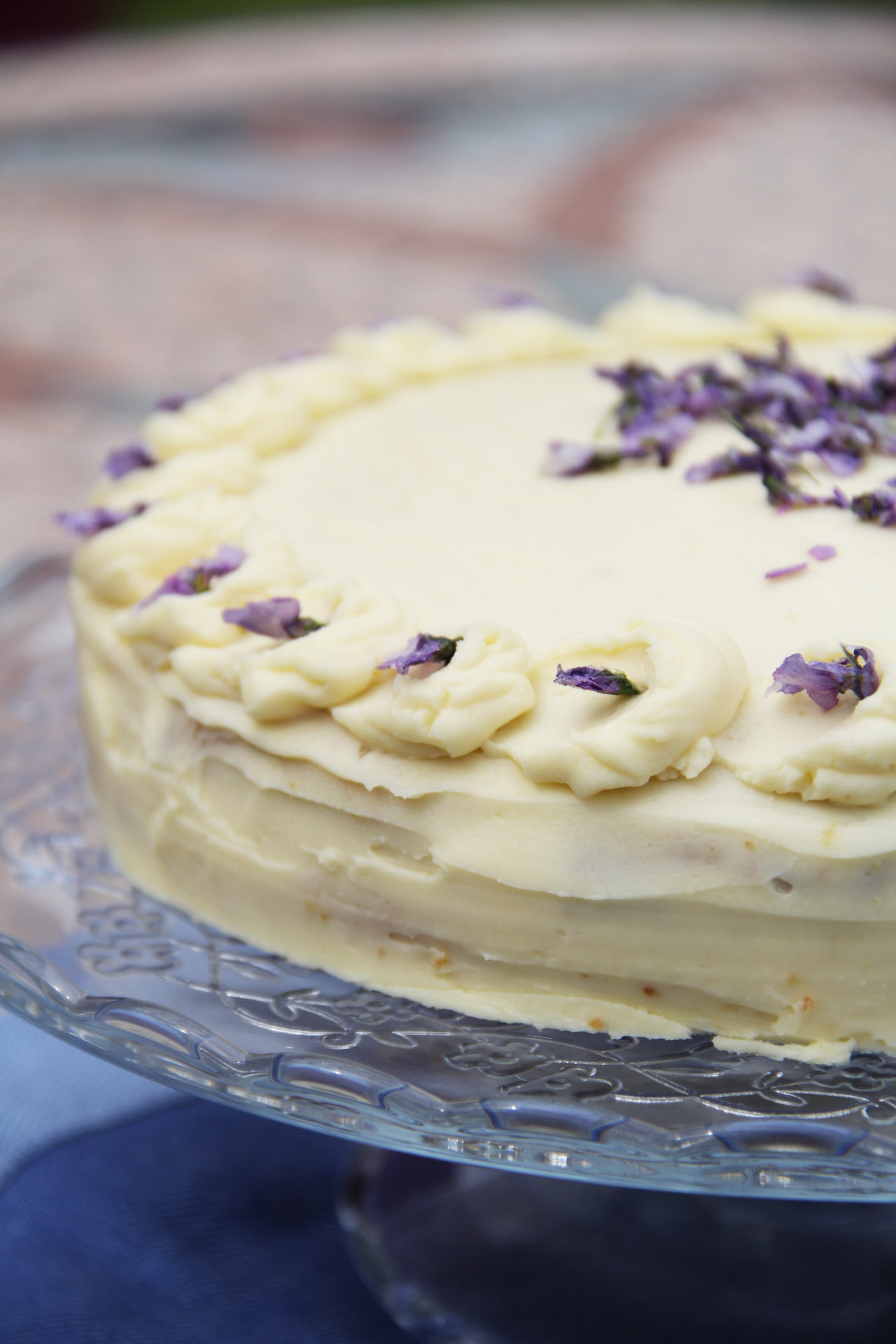 - Do cukrářského sáčku dám zbylých 6 lžic krému a na dort udělám jednu malou pusinku. Obrácenou čajovou lžičkou ji rozetřu do ztracena a na jejím konci udělám pusinku další. Pokračuju, až bude celý dort ozdobený. Protože mám po ruce proslazené fialkové květy, ozdobím jimi, ale klidně použijte jakékoliv jiné květy nebo citronové plátky.